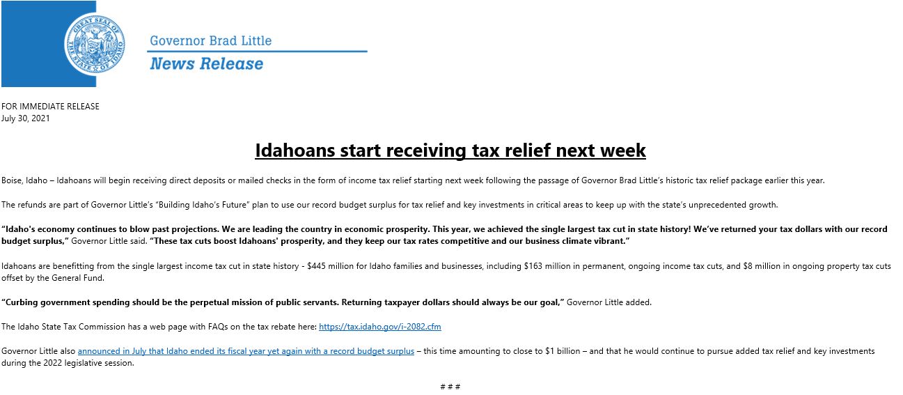 Brandon D Woolf On Twitter My Office Is Proud To Partner With The Idaho State Tax Commission To Process And Distribute Income Tax Relief Payments Via Direct Deposit Or Mailed Checks To